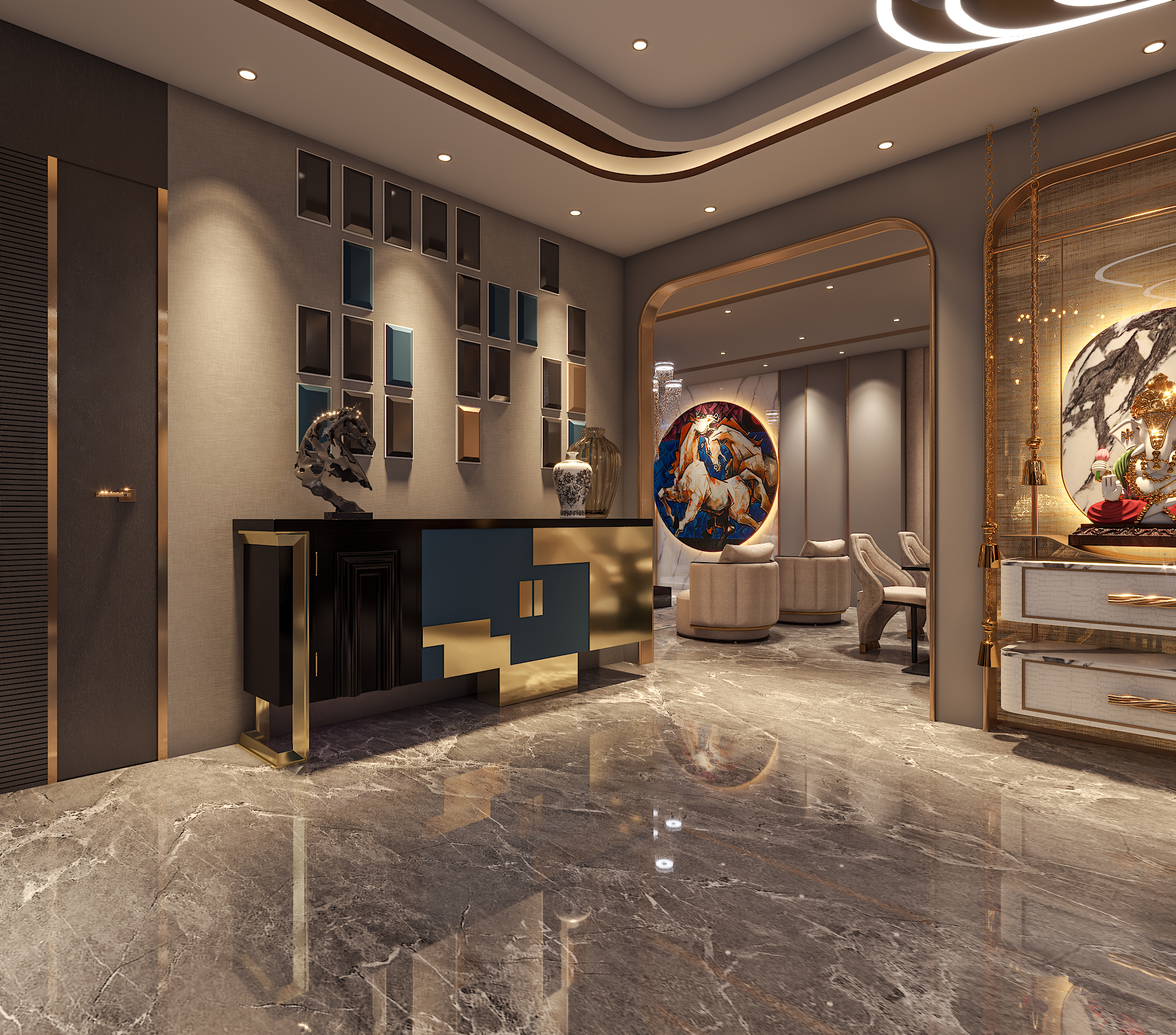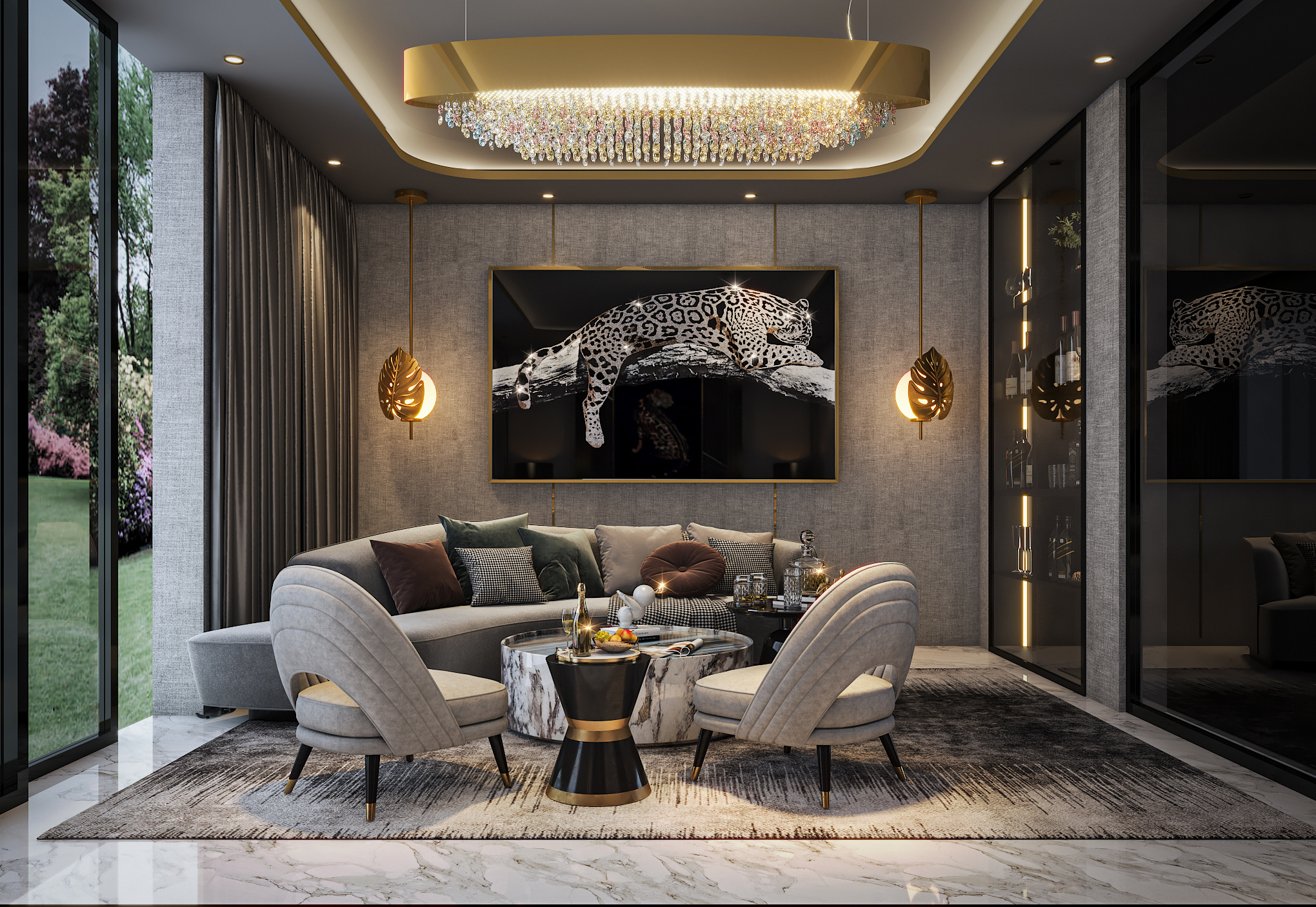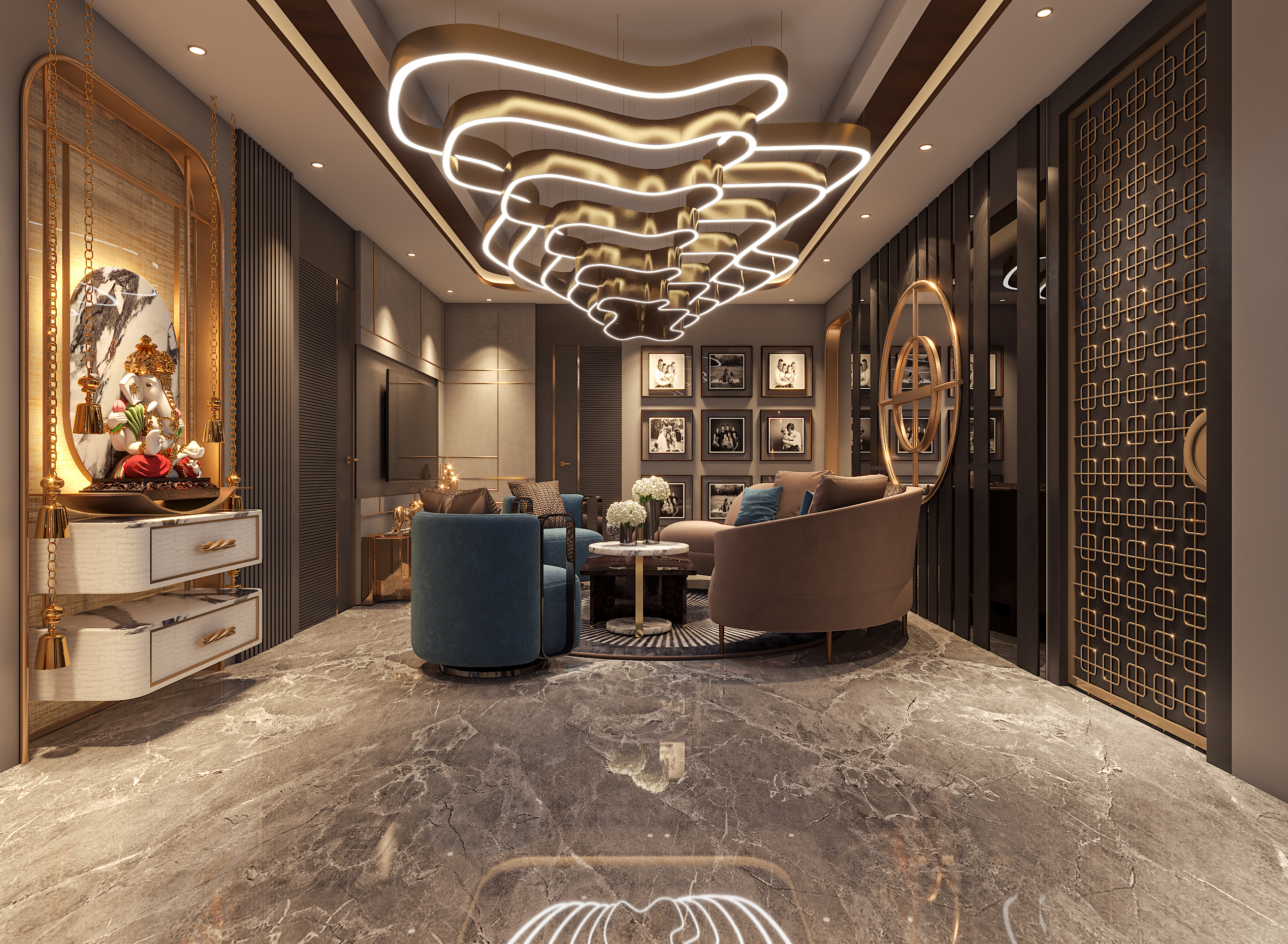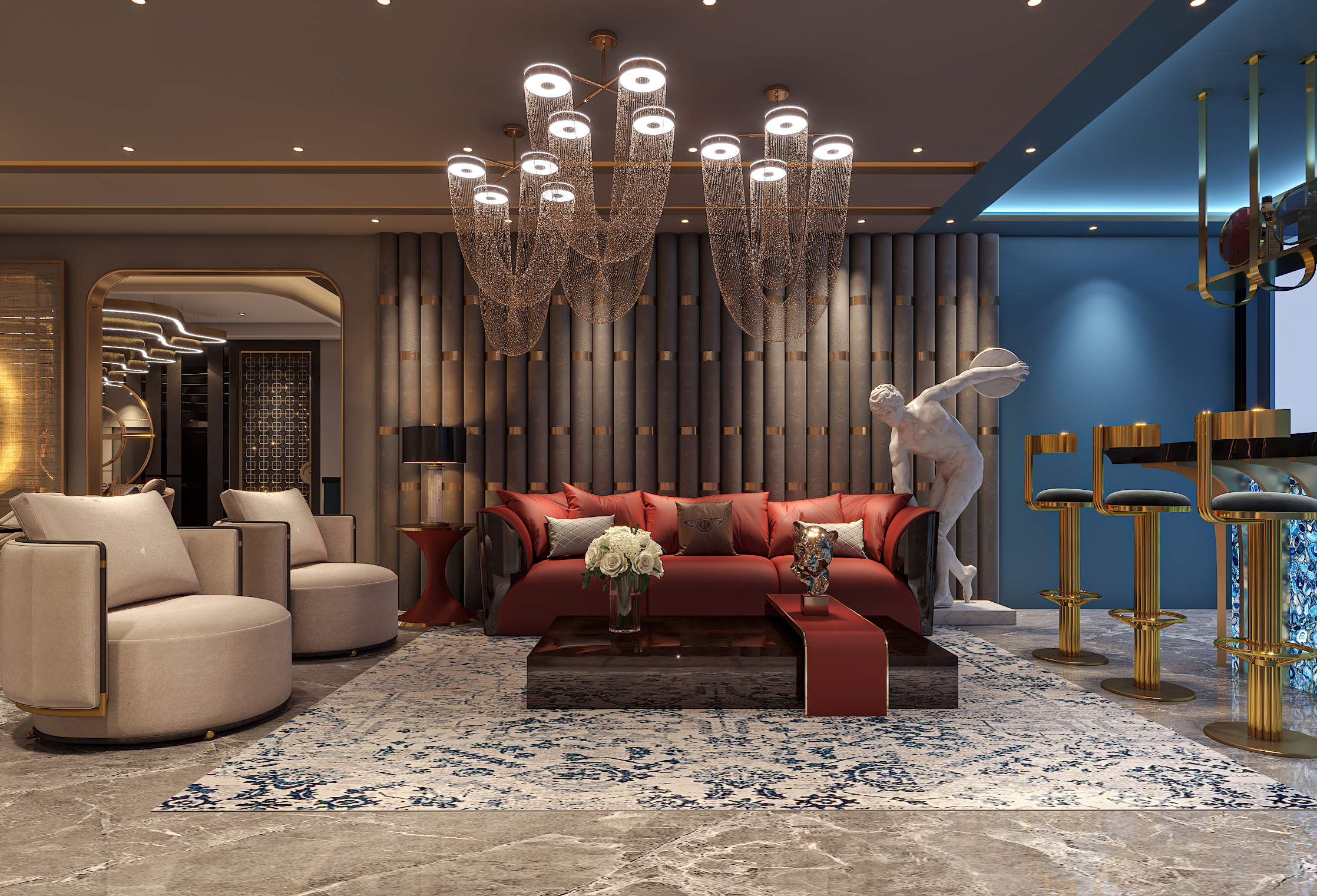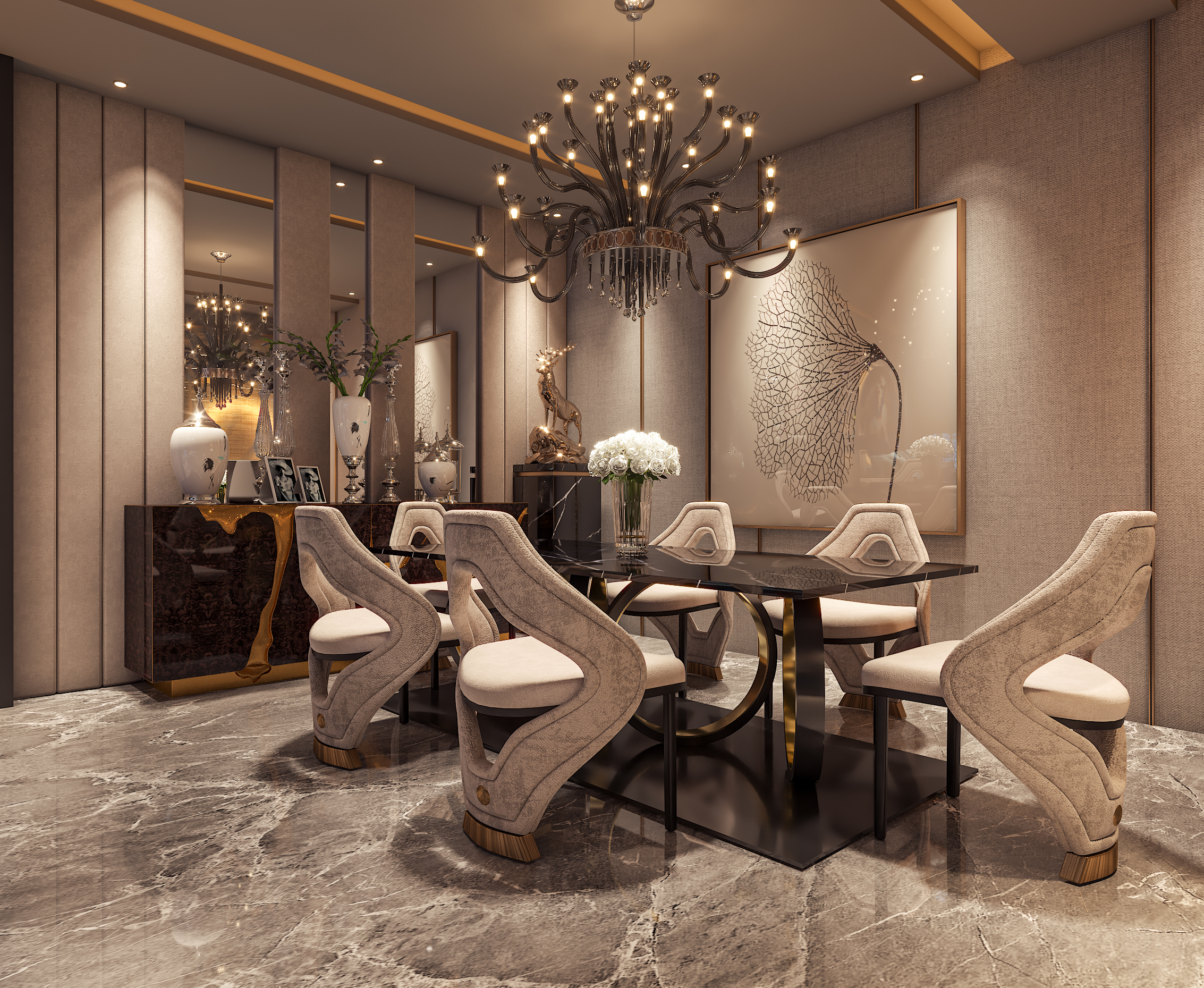 This luxury interior design project is a perfect blend of opulence and contemporary flair. Featuring custom furniture, a dramatic statement chandelier, and an oversized modern art piece, it establishes a sophisticated and exclusive dining room experience.