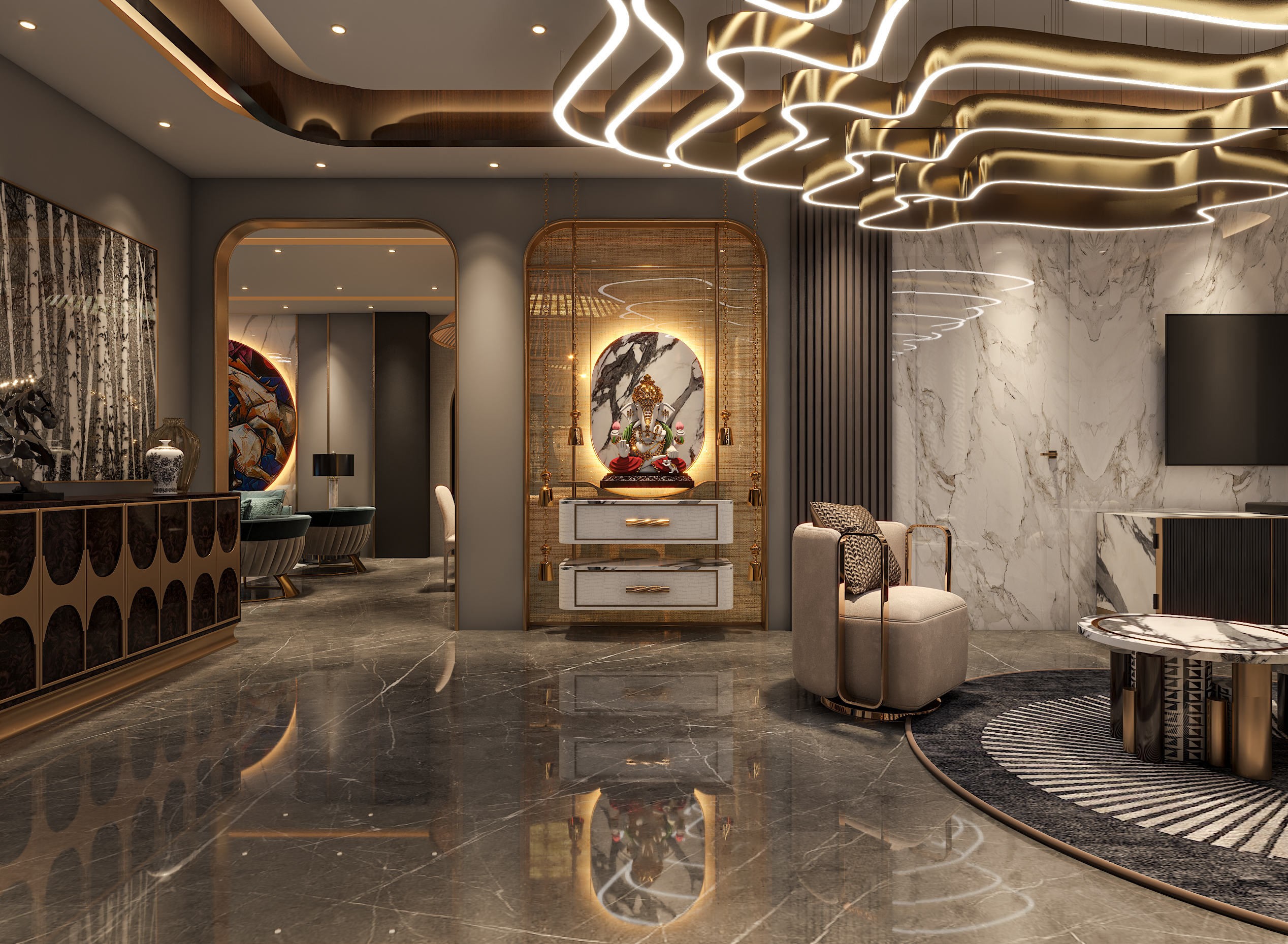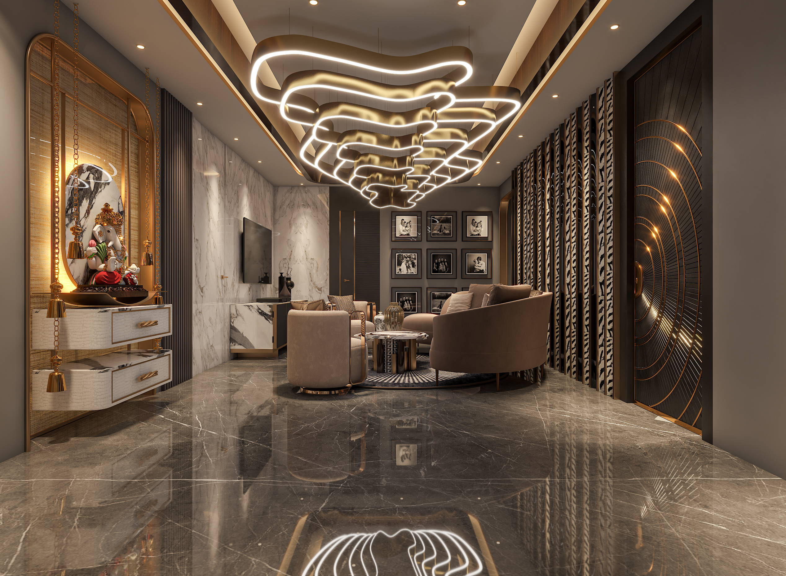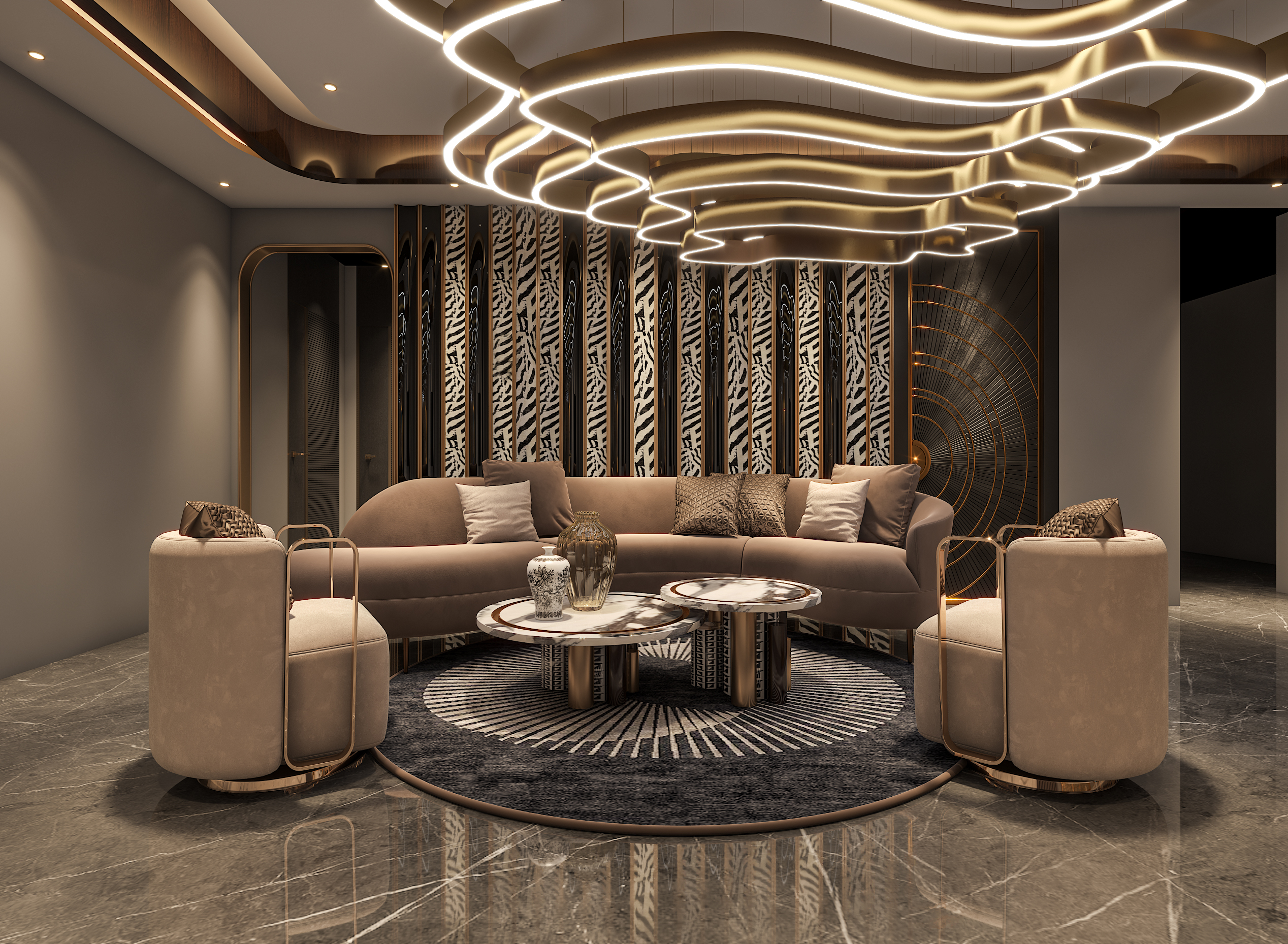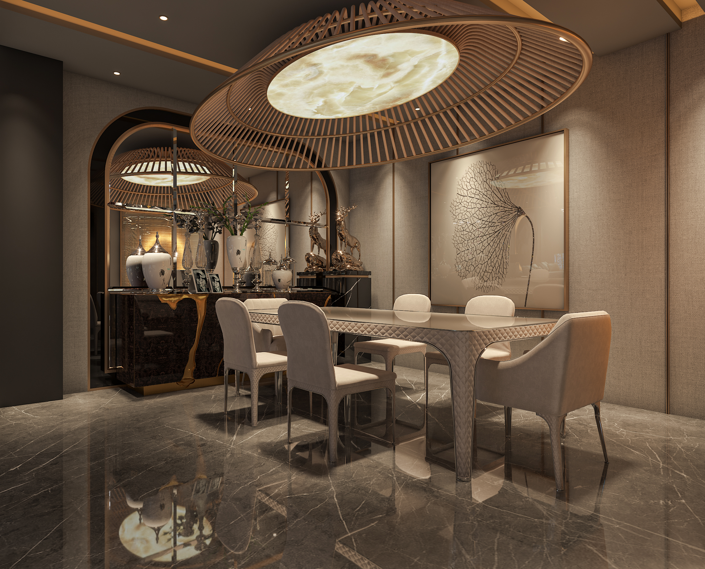 The design flows effortlessly into a refined dining space, where a minimalist table is complemented by graceful seating and a unique, sculpted chandelier, echoing the artistry of the entire room. Custom marble surfaces, intricate rugs, and strategic lighting complete a space that is both visually stunning and profoundly comfortable, ideal for grand entertaining or serene daily living.