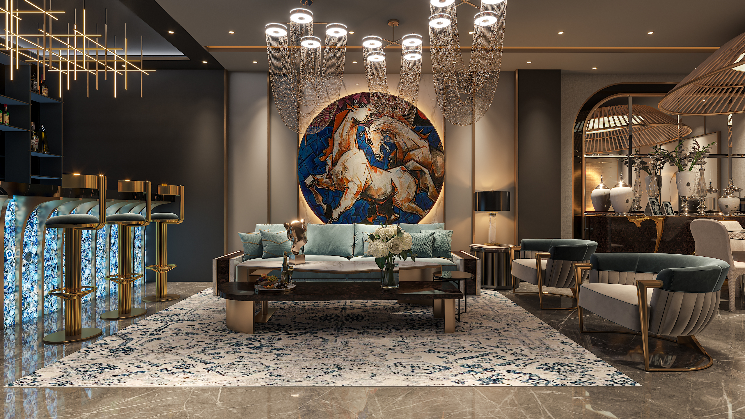 This project showcases a magnificent open-concept living and dining area, meticulously designed for discerning tastes. At its heart, a commanding circular equine artwork provides a vibrant focal point, seamlessly integrating classical artistic grandeur into a modern luxury interior. The living area is a testament to sophisticated comfort, featuring expansive azure velvet sofas accented with polished gold details, inviting relaxation and elegant entertaining.