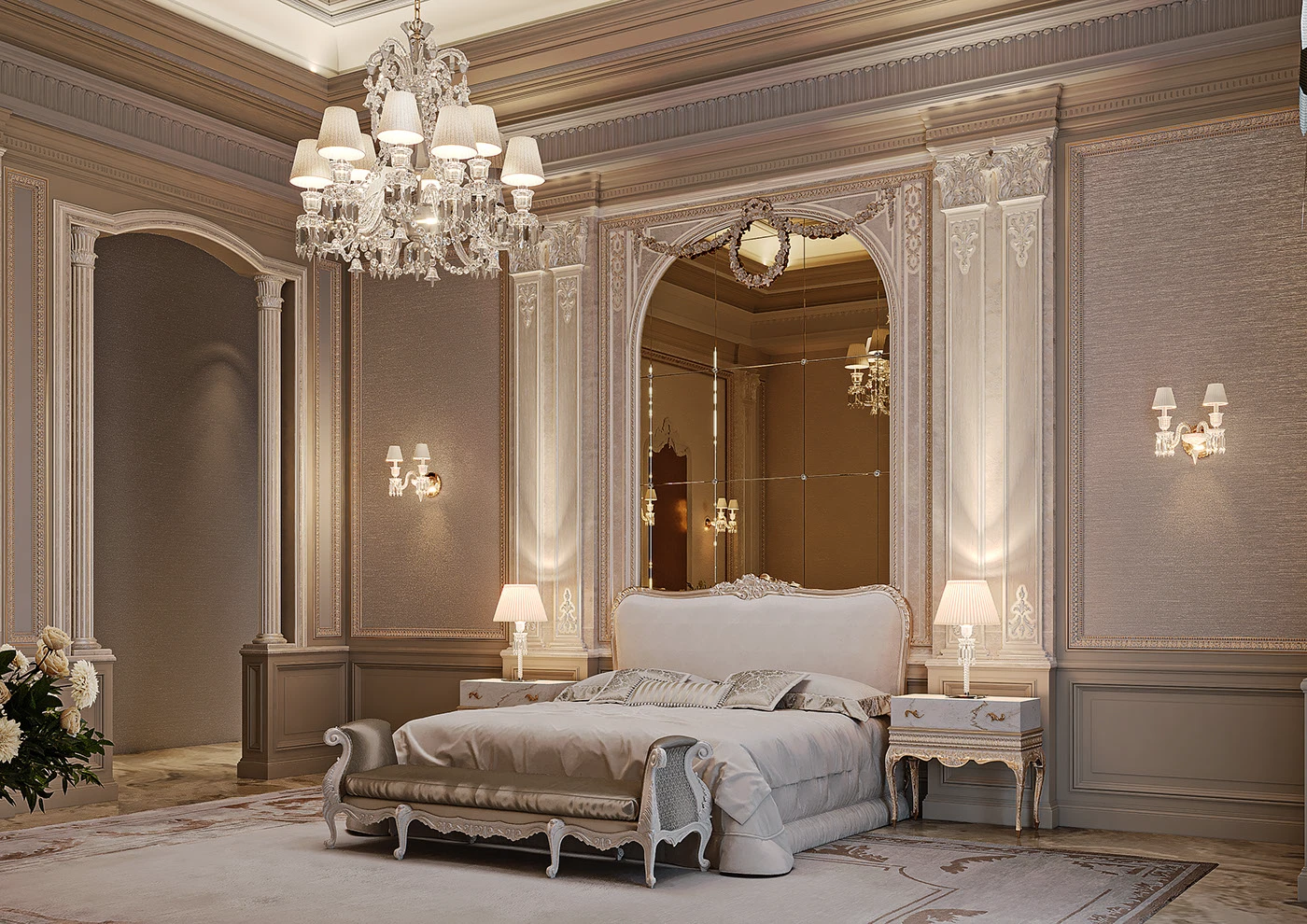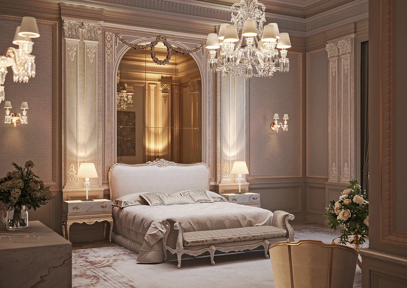This luxury classic bedroom interior design by Noor ul Ain Interior features a royal aesthetic with Italian marble, velvet textures, and intricate wall moldings. Every element exudes sophistication, offering a serene and premium lifestyle experience.
