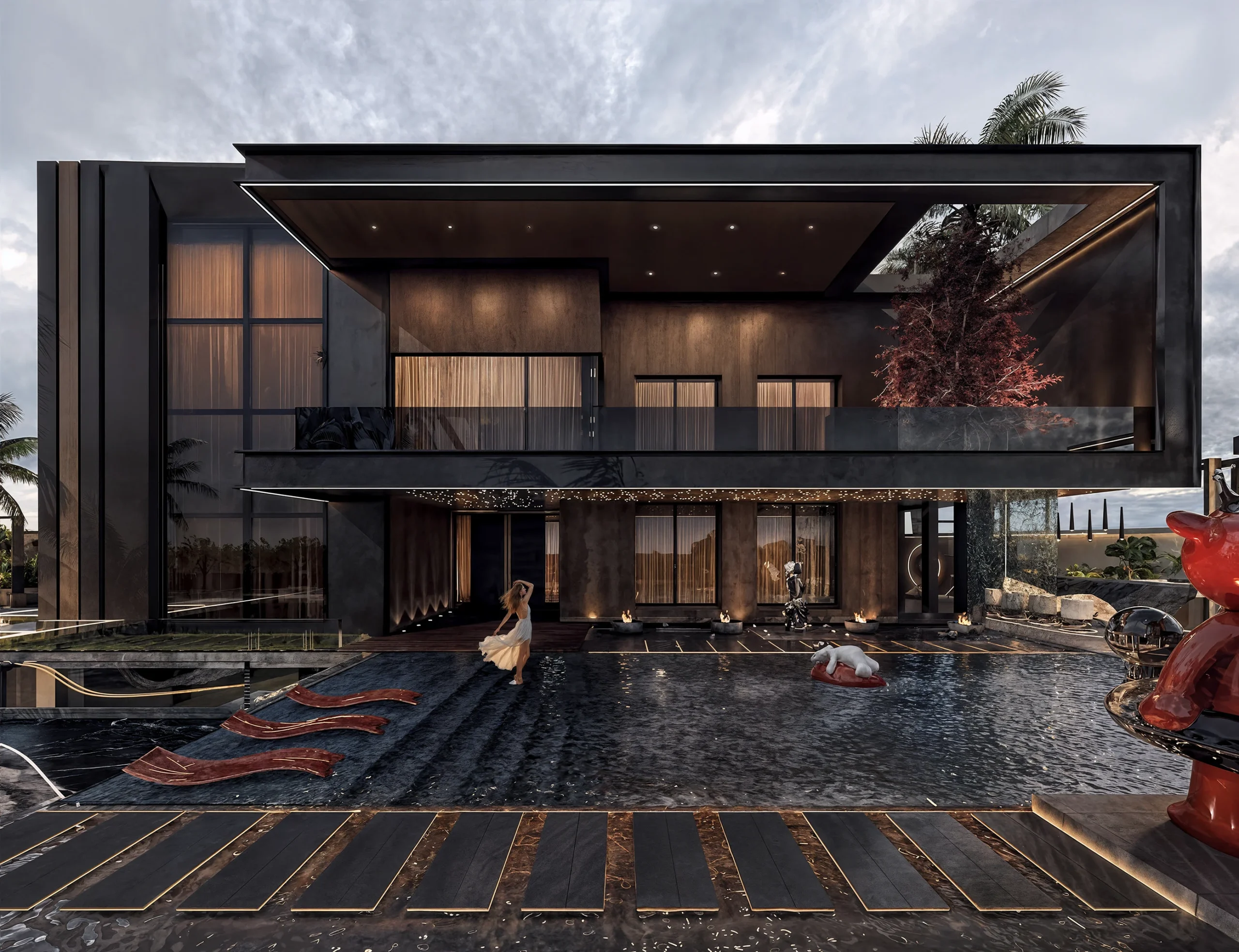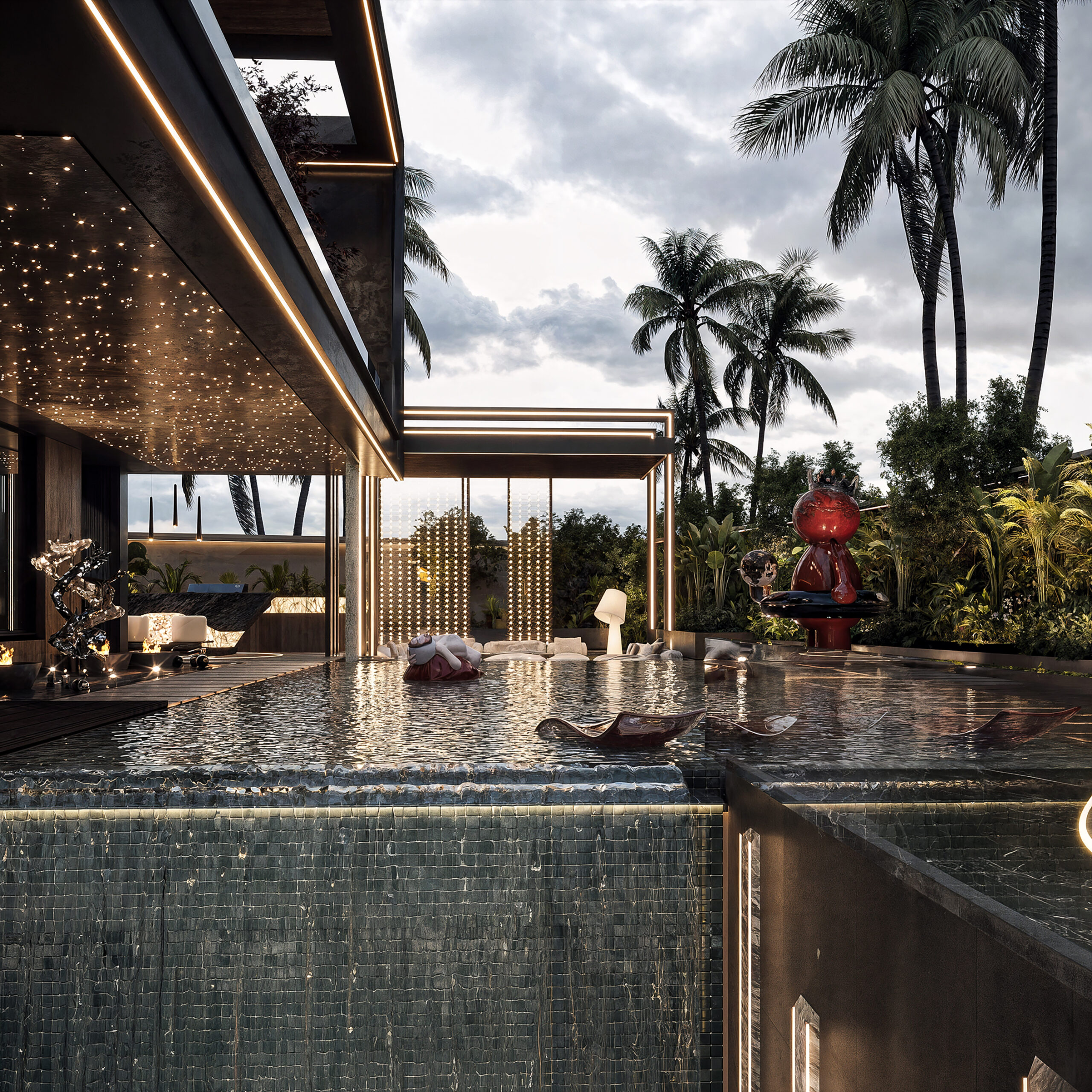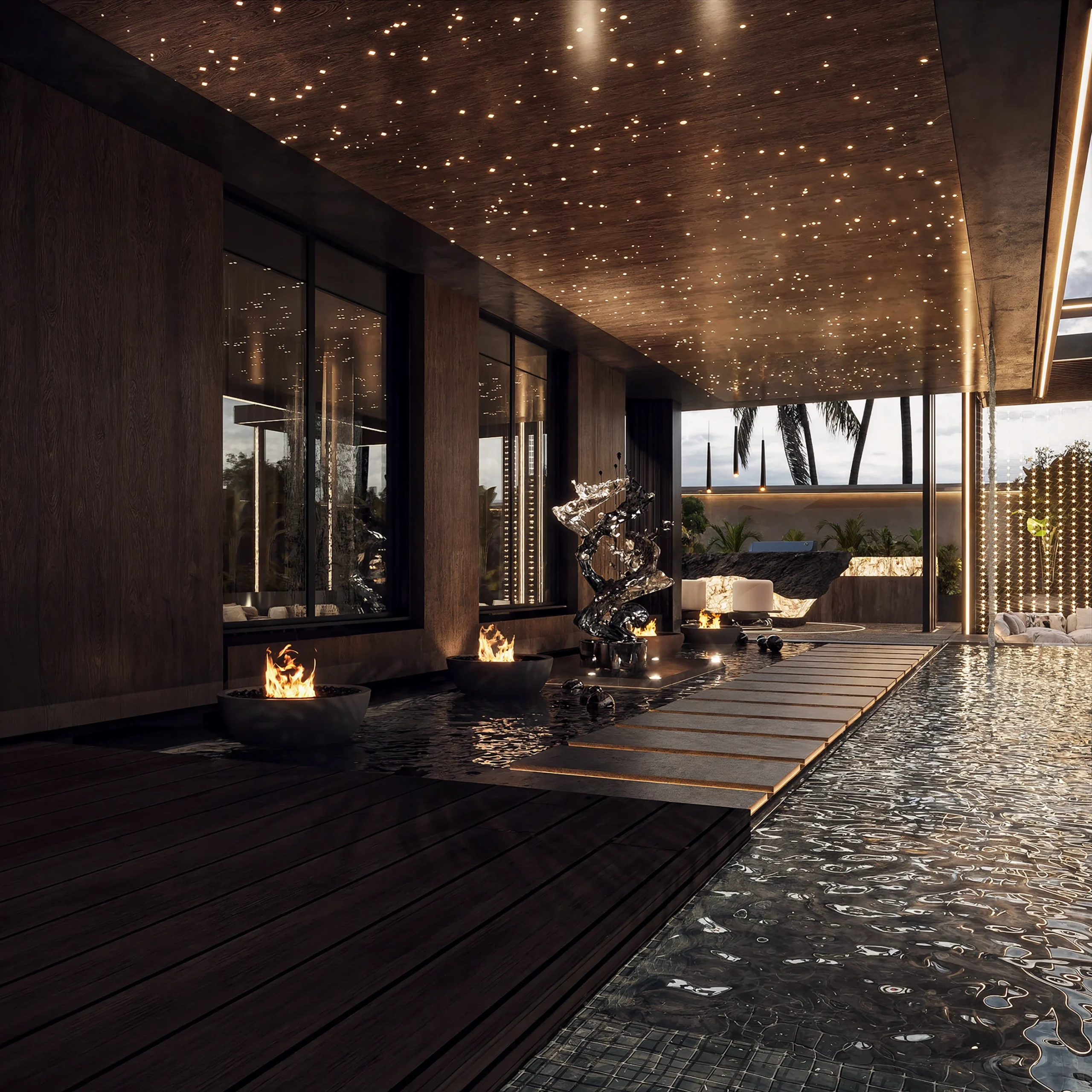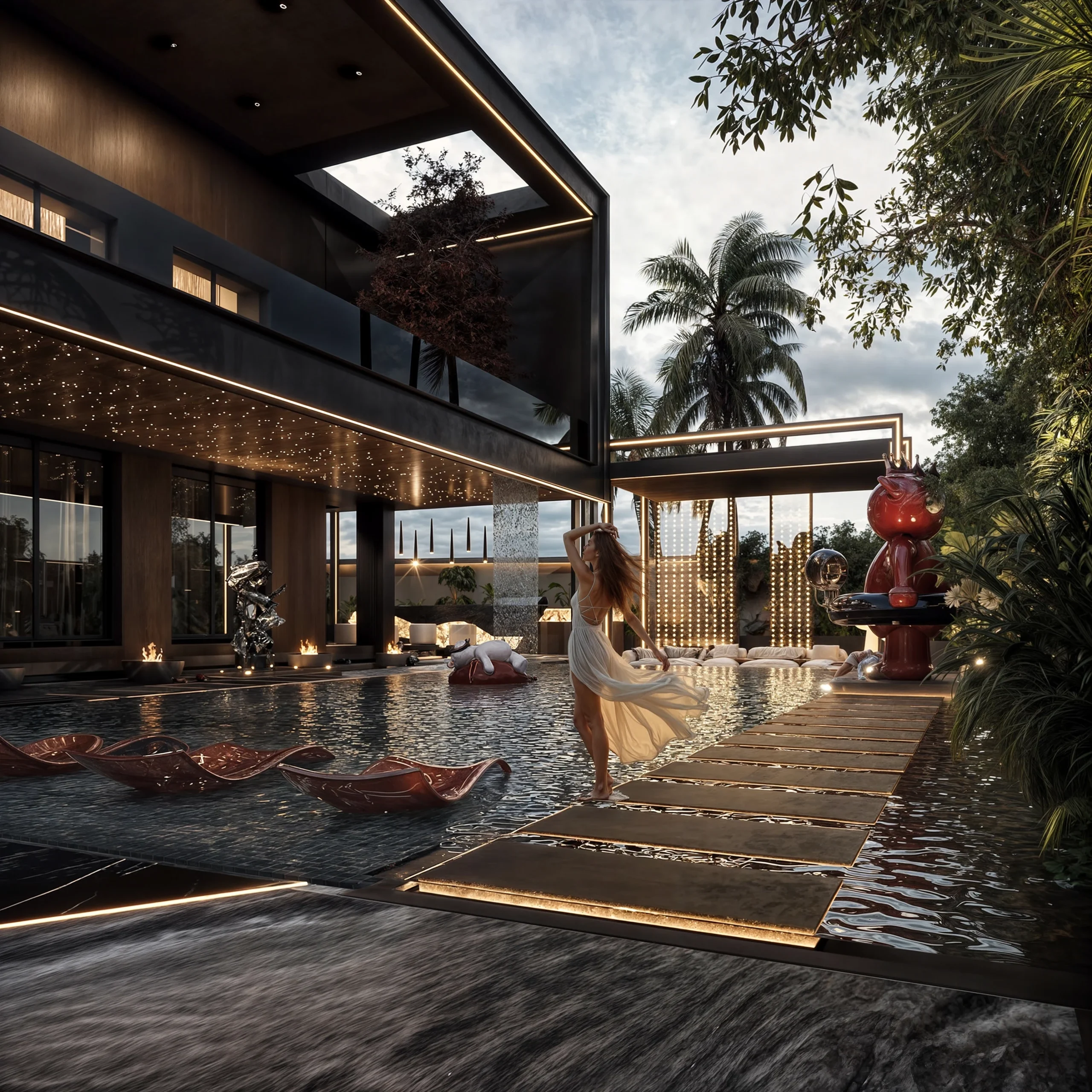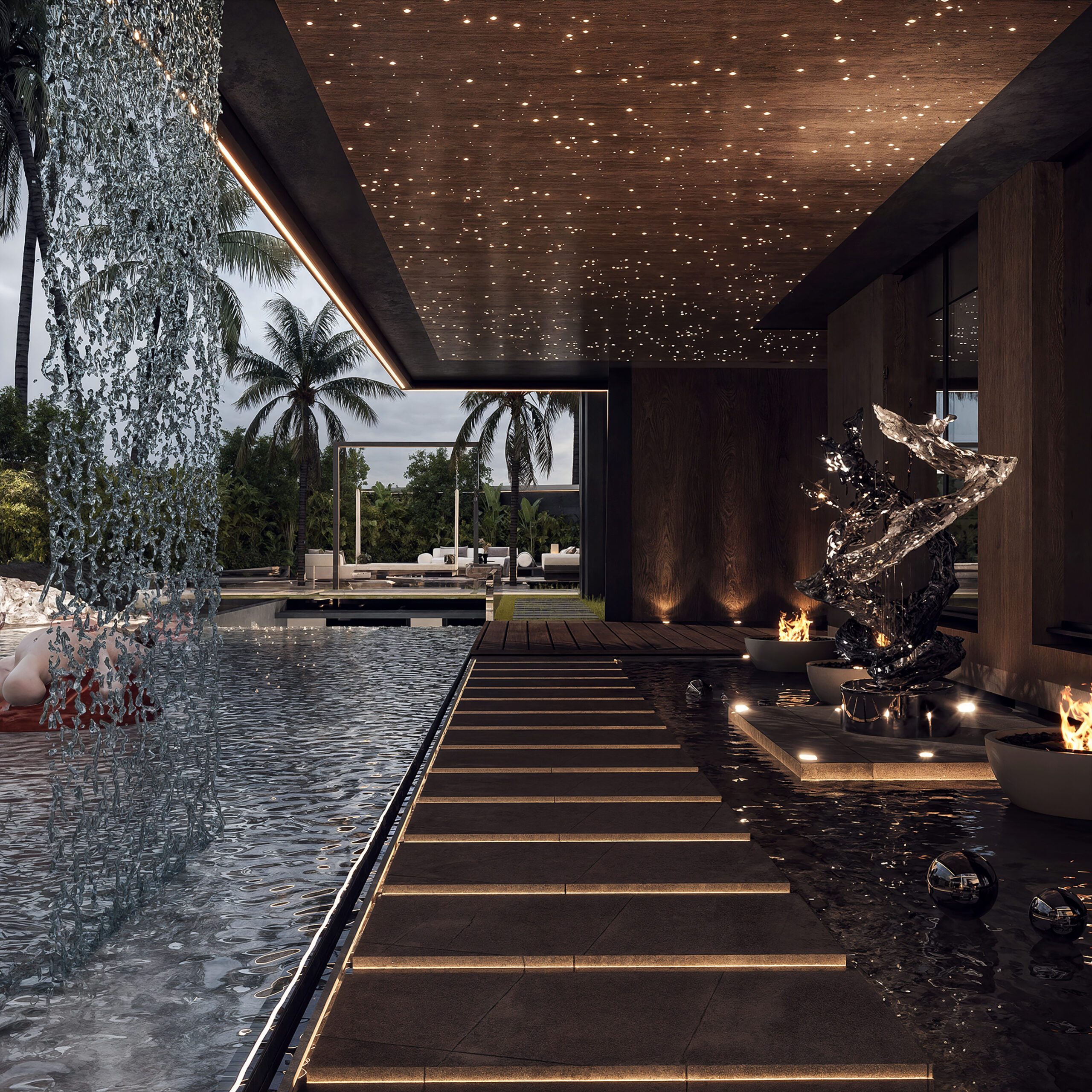 This exclusive exterior design creates an ultra-luxury entertainment space through sophisticated lighting and water features. The contemporary architectural design seamlessly blends the indoor and outdoor areas, defining a high-end lifestyle characterized by dramatic aesthetics and unparalleled quality.
