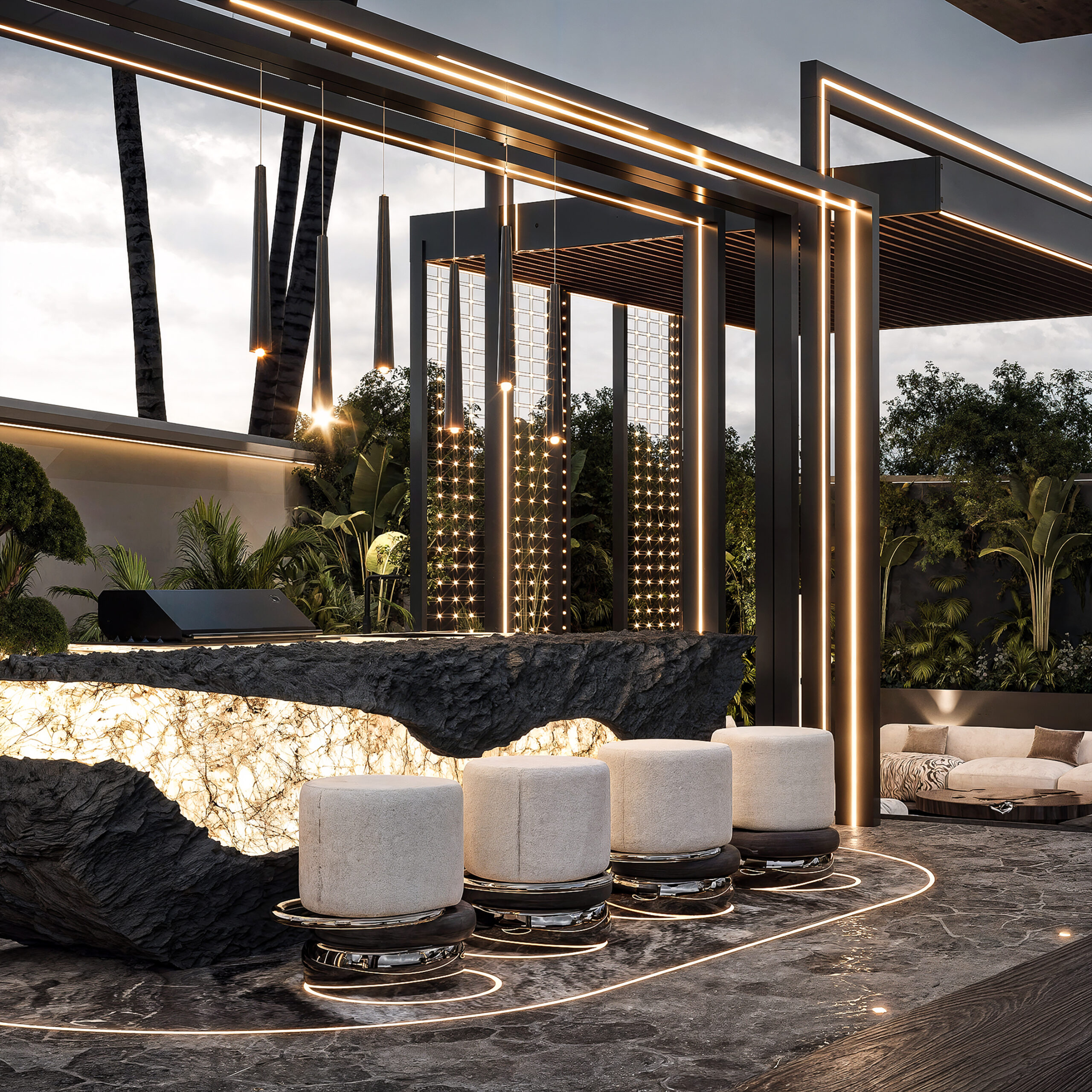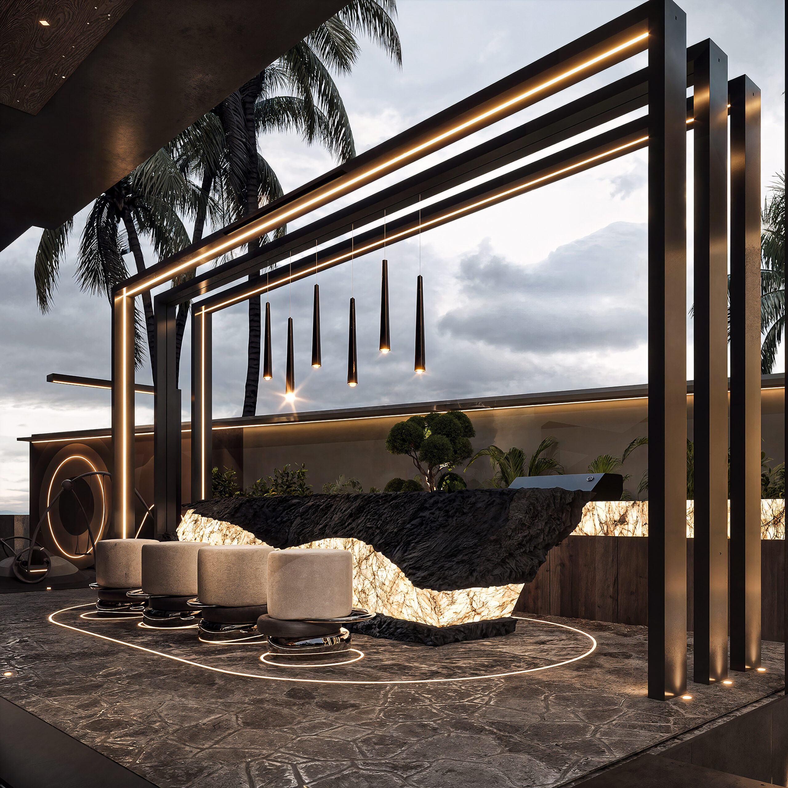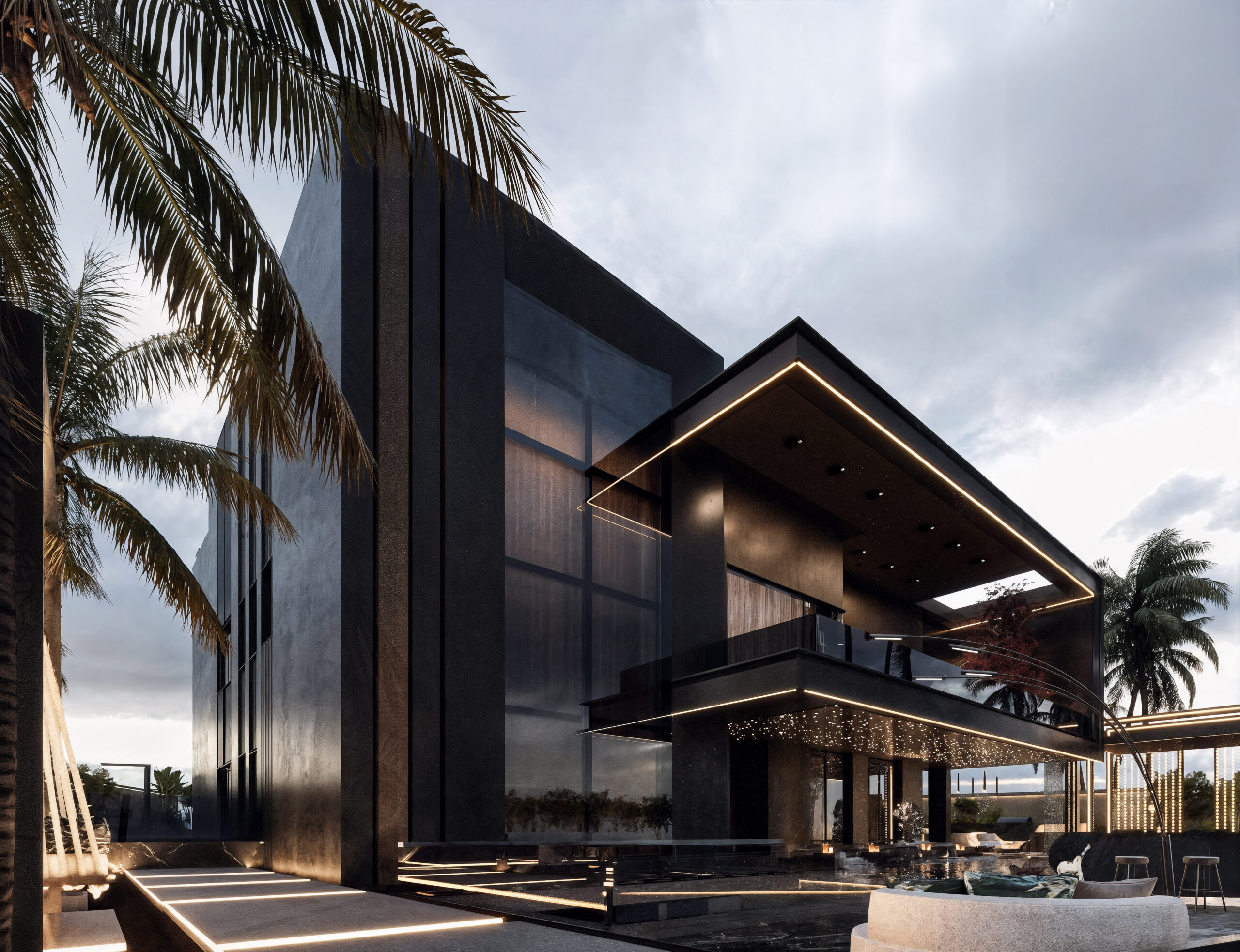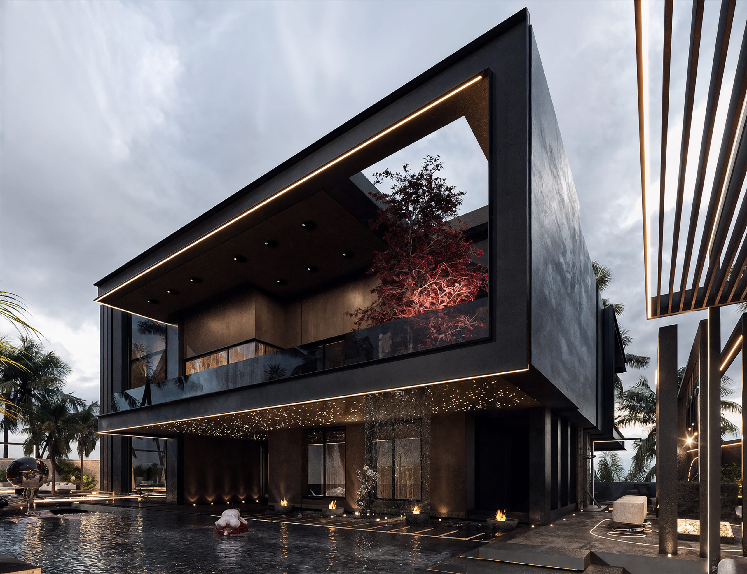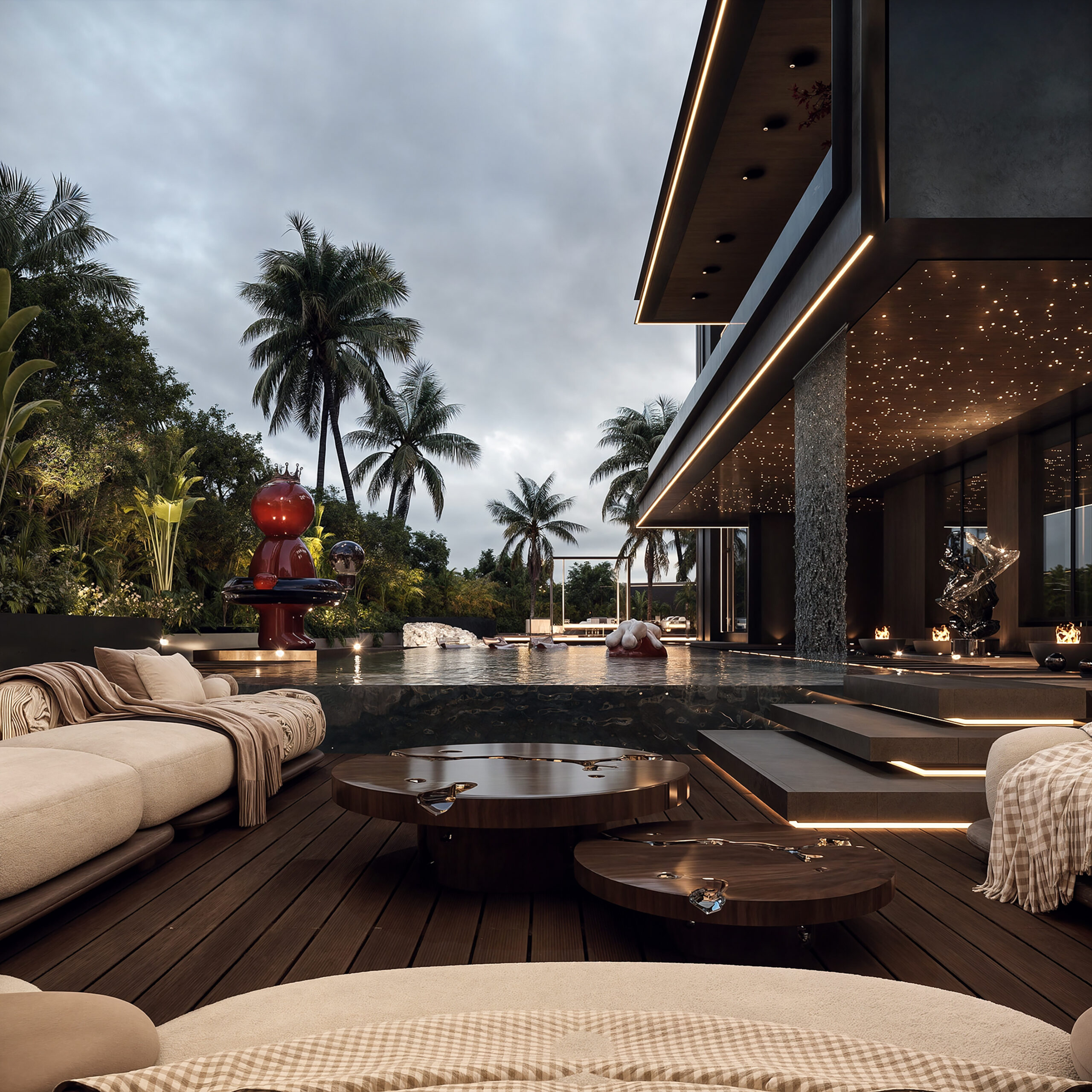 This exclusive exterior design creates an ultra-luxury entertainment space through sophisticated lighting and water features. The contemporary architectural design seamlessly blends the indoor and outdoor areas, defining a high-end lifestyle characterized by dramatic aesthetics and unparalleled quality.