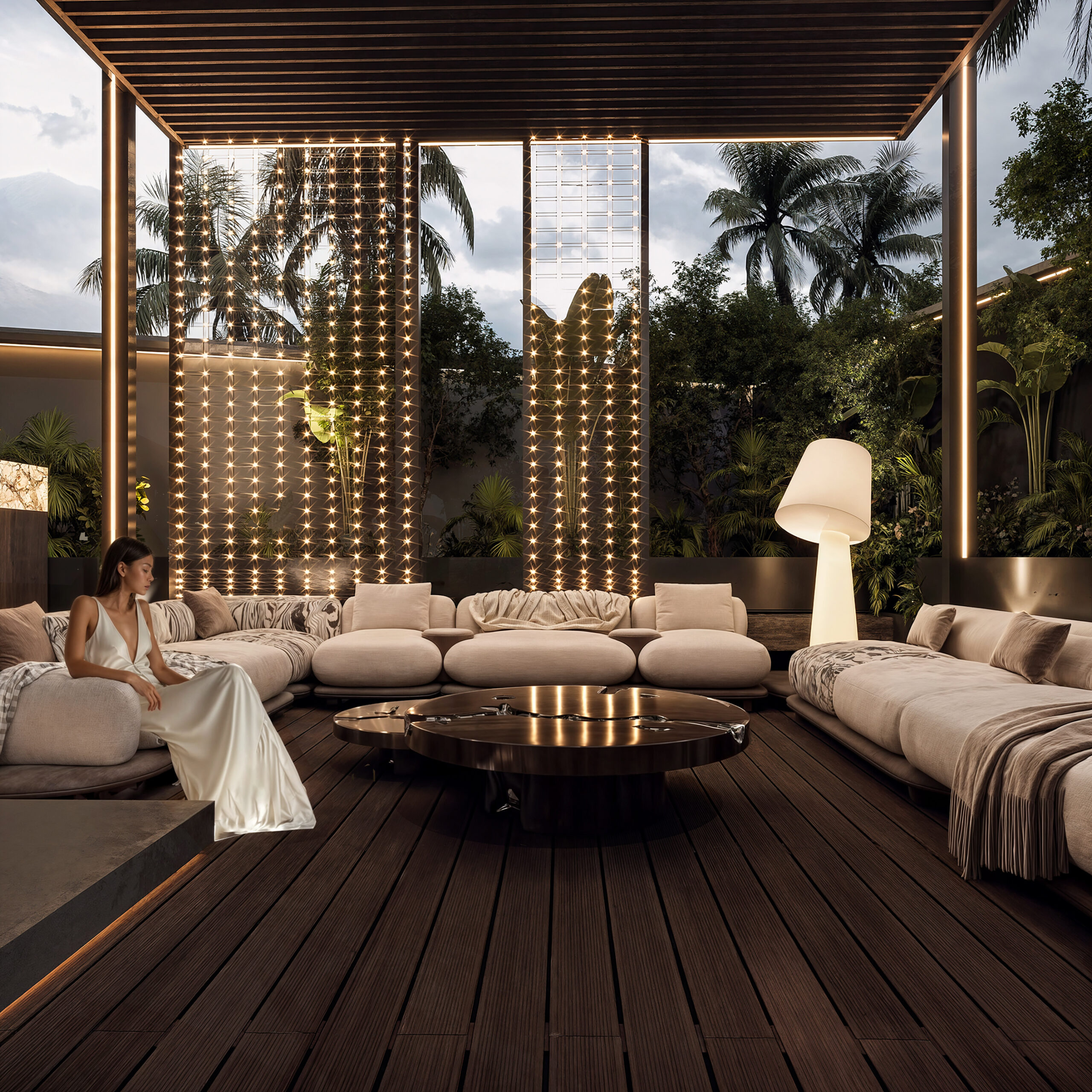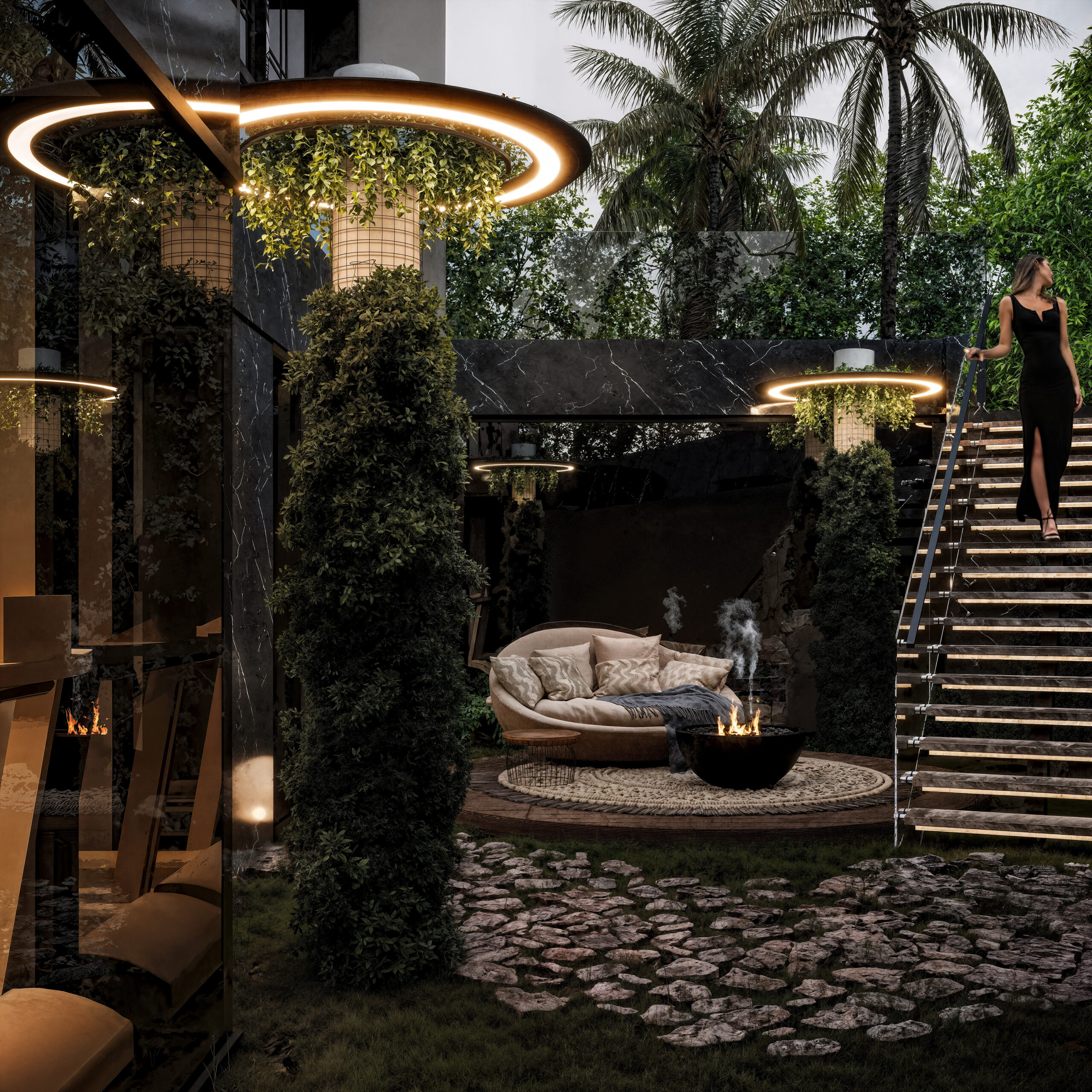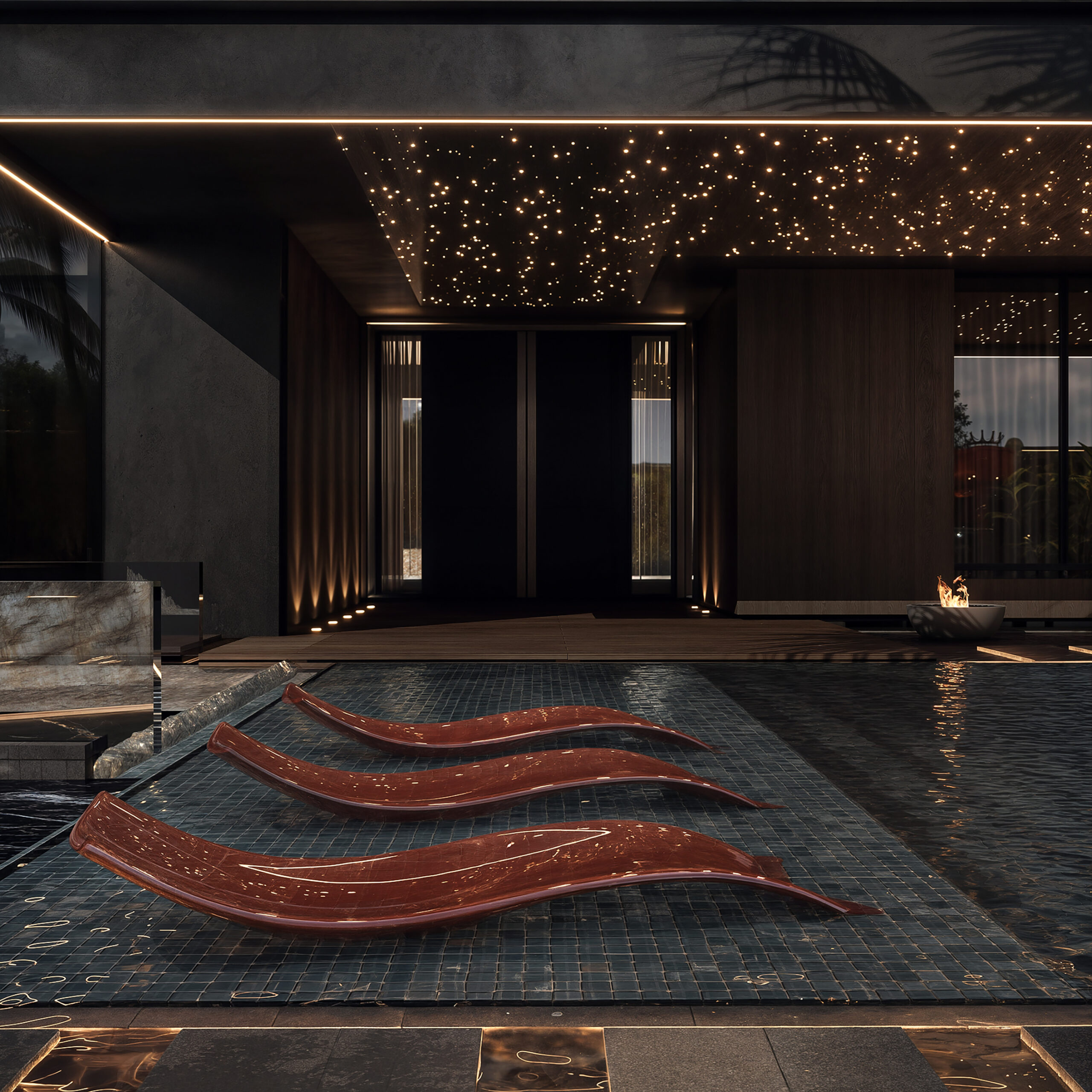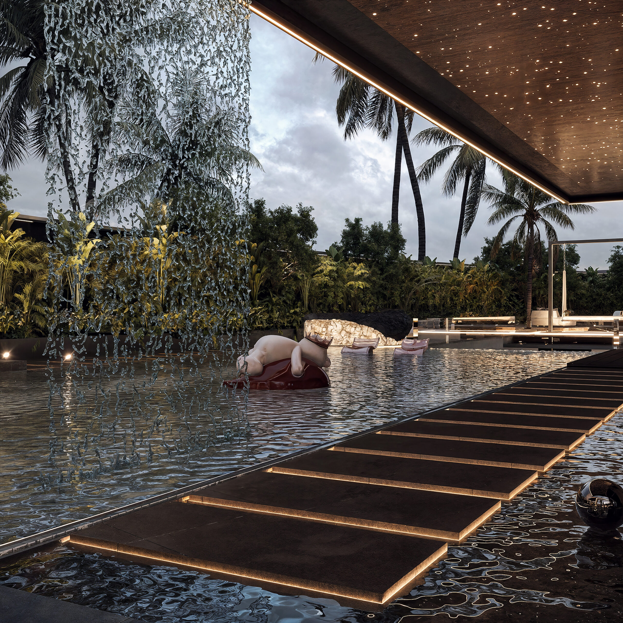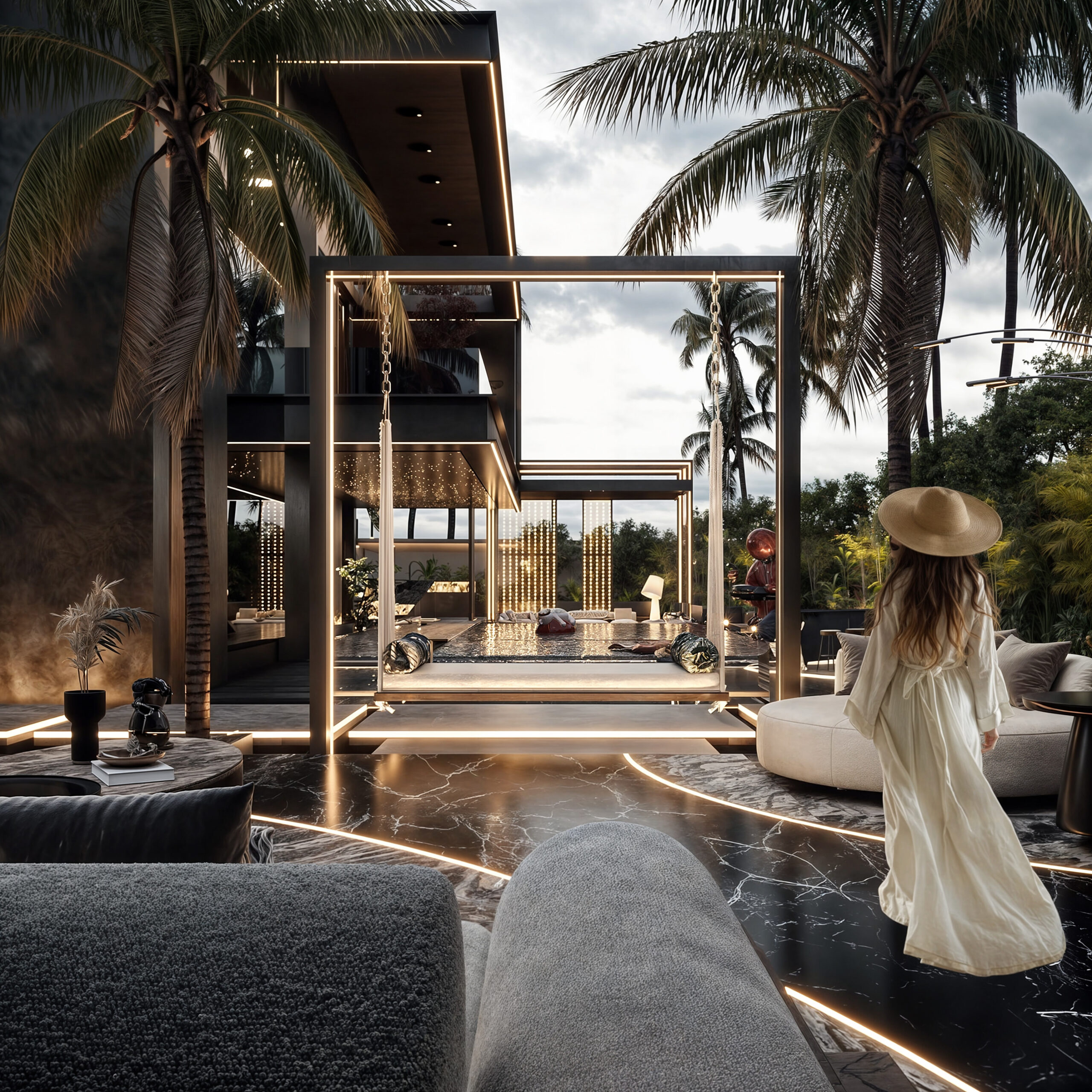 This exclusive exterior design creates an ultra-luxury entertainment space through sophisticated lighting and water features. The contemporary architectural design seamlessly blends the indoor and outdoor areas, defining a high-end lifestyle characterized by dramatic aesthetics and unparalleled quality.