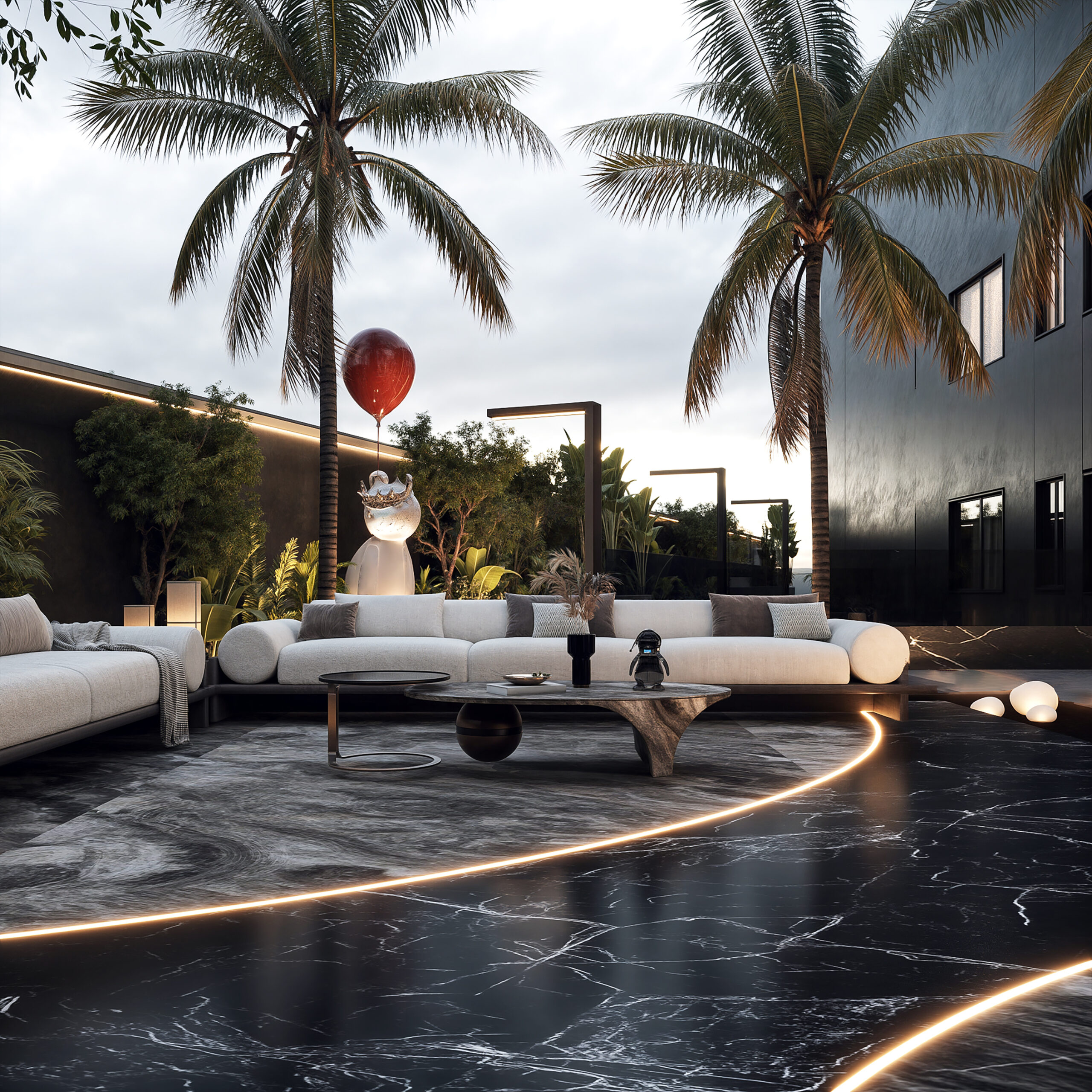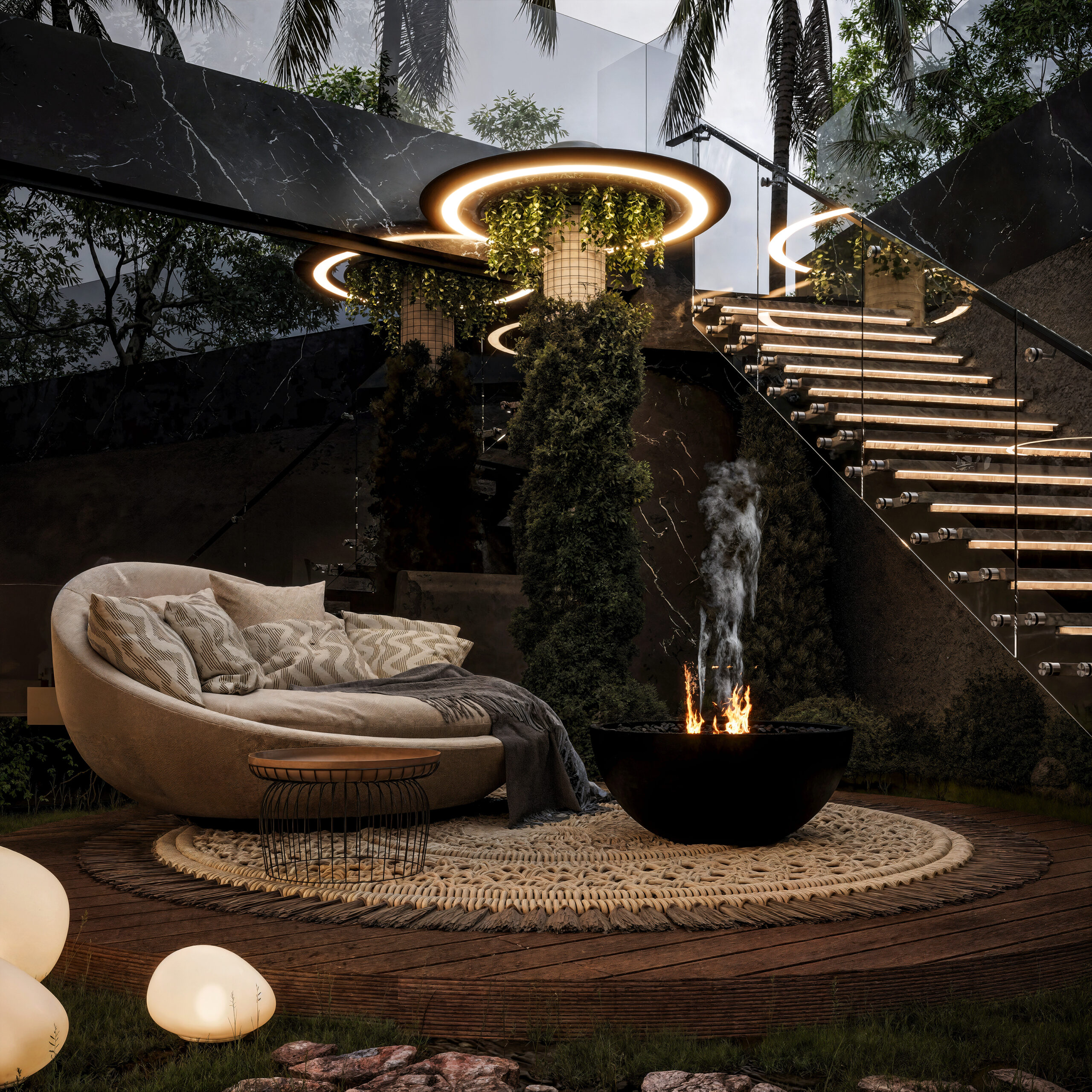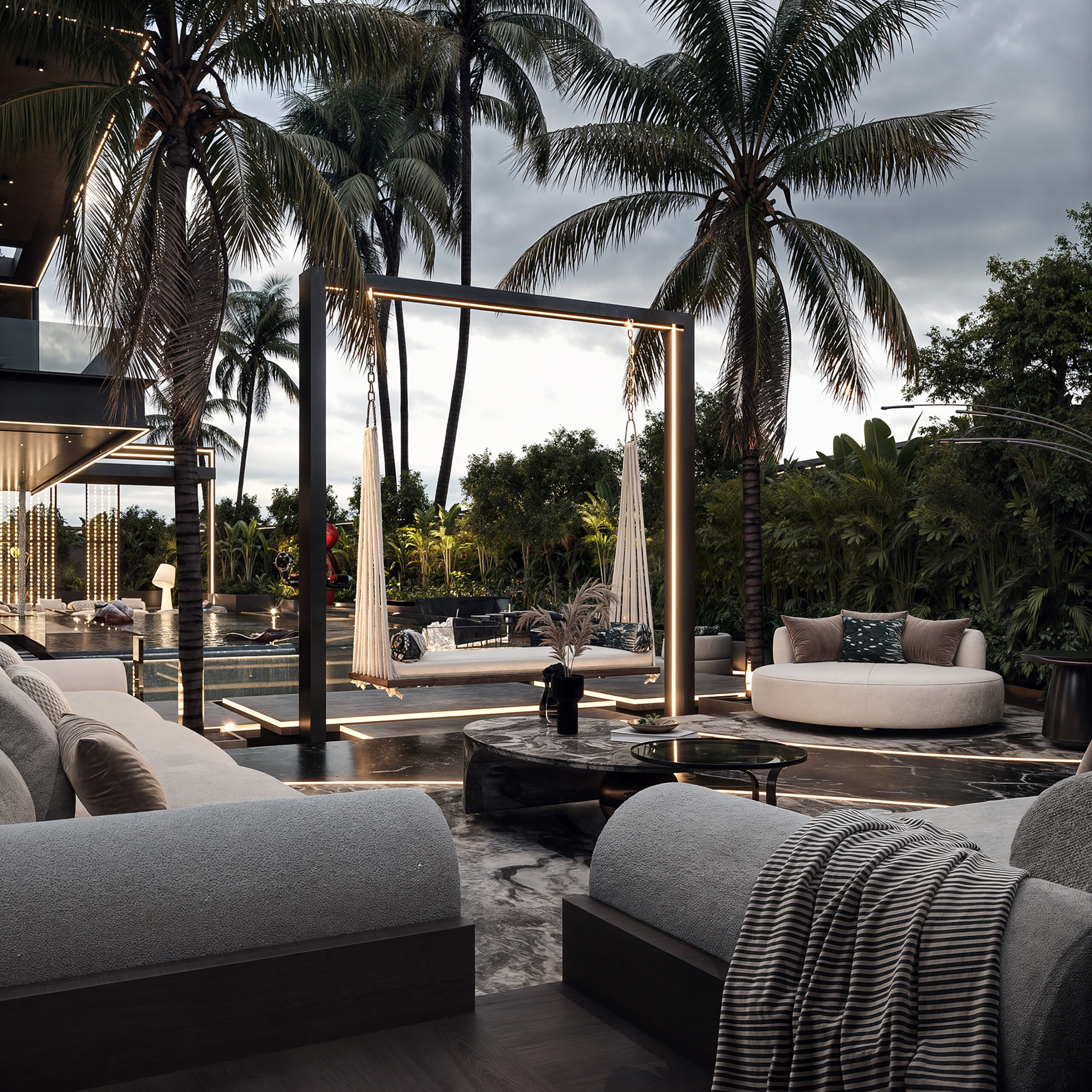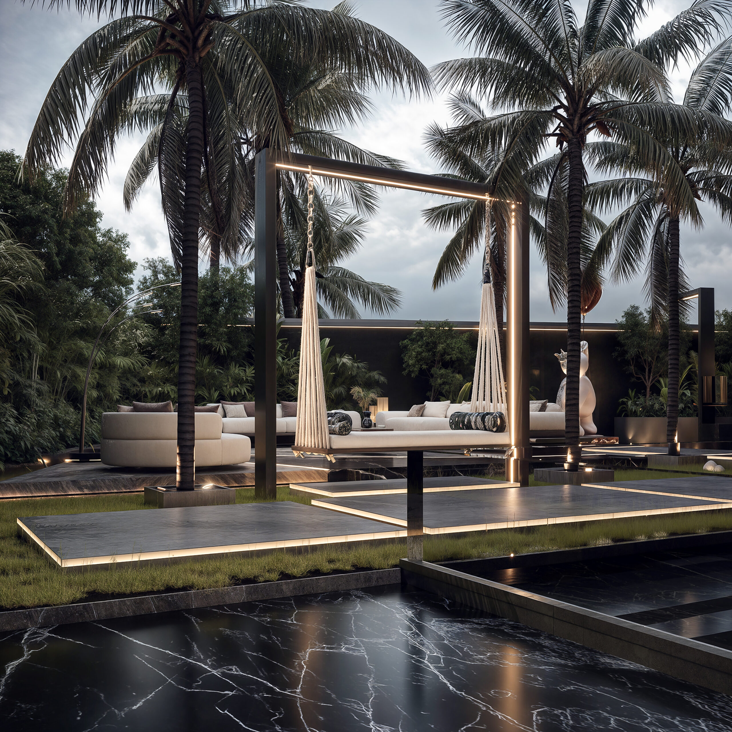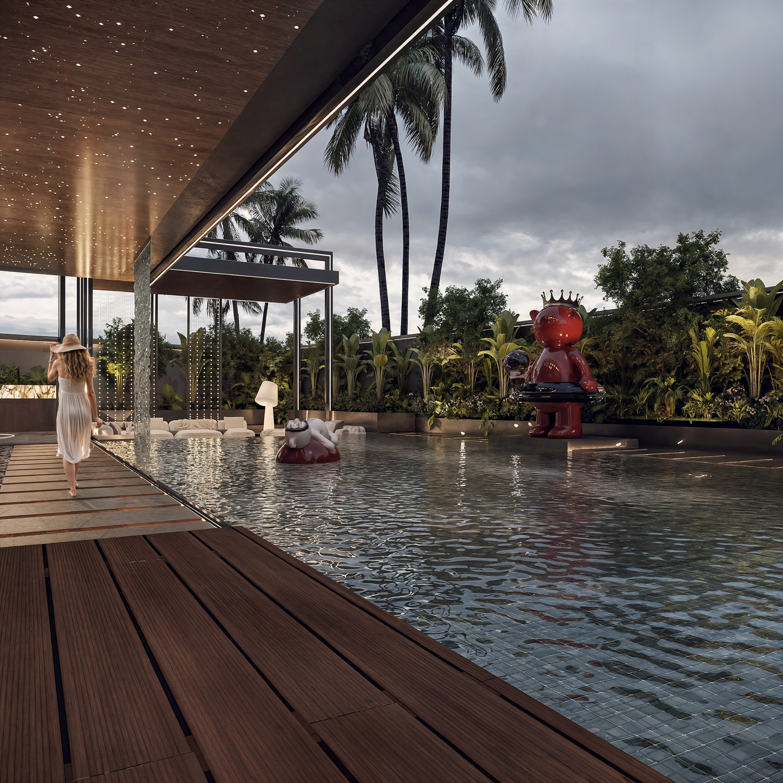 This exclusive exterior design creates an ultra-luxury entertainment space through sophisticated lighting and water features. The contemporary architectural design seamlessly blends the indoor and outdoor areas, defining a high-end lifestyle characterized by dramatic aesthetics and unparalleled quality.
