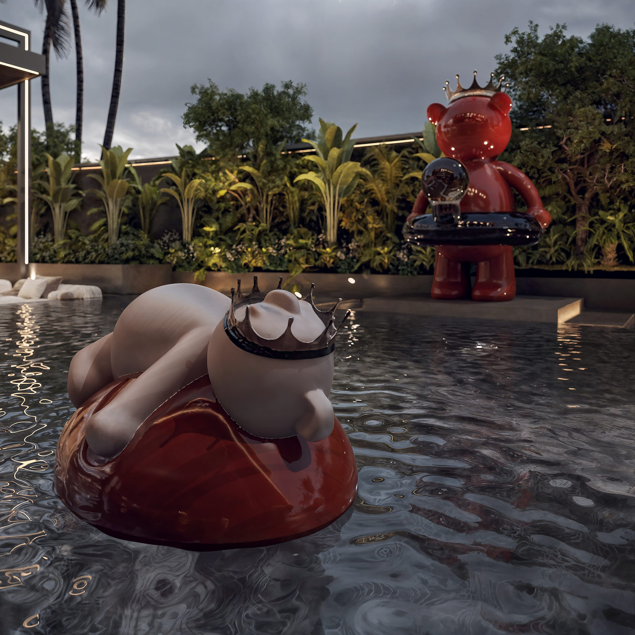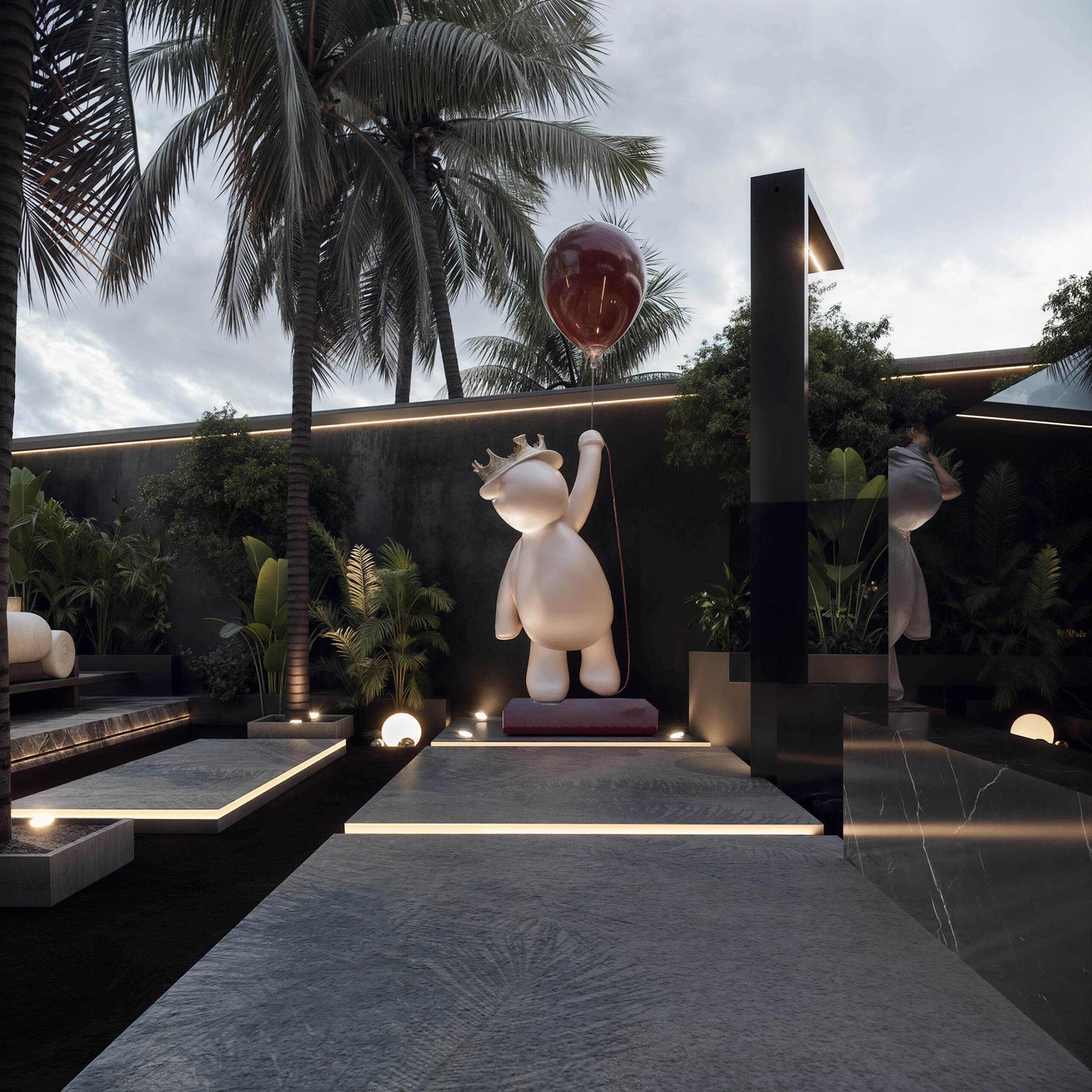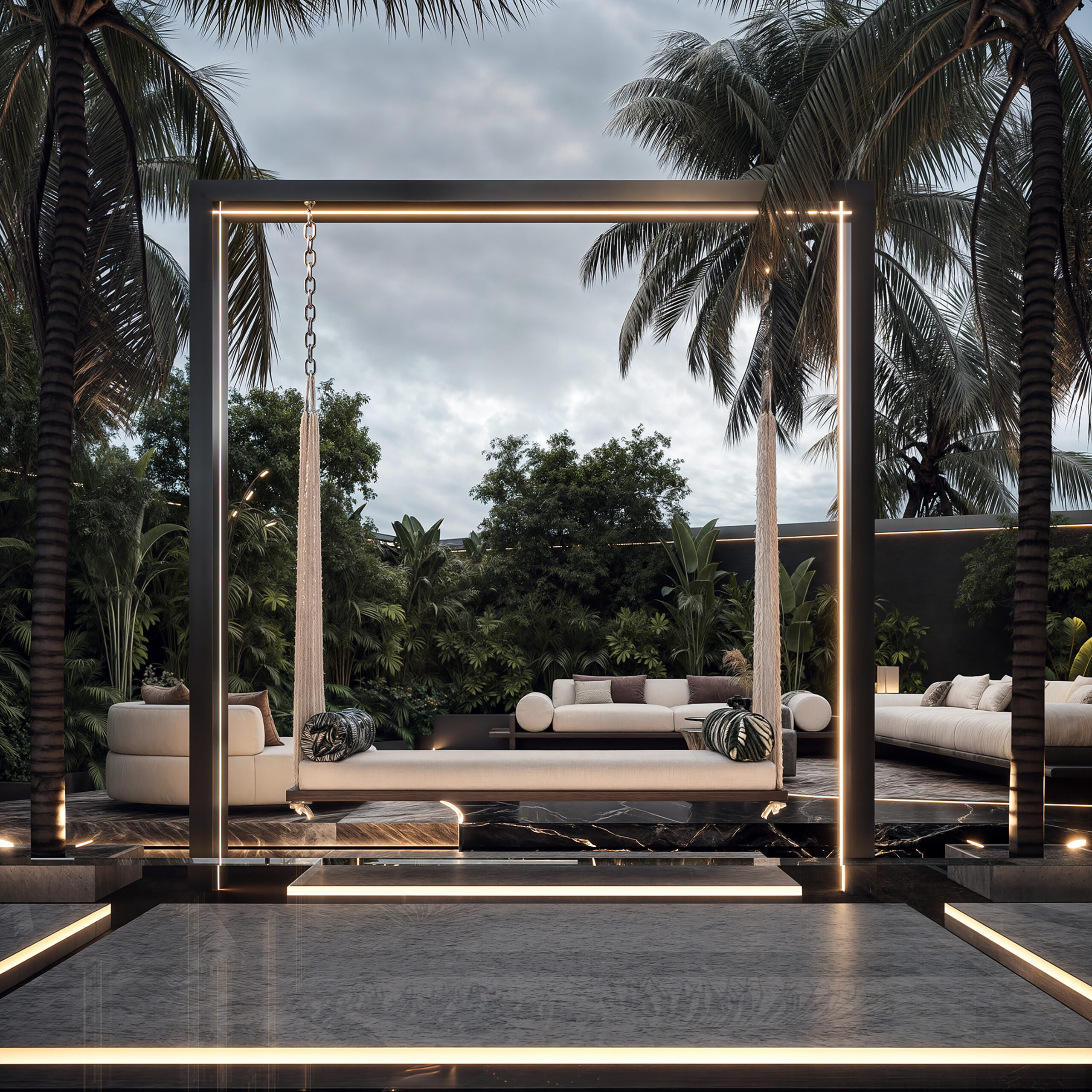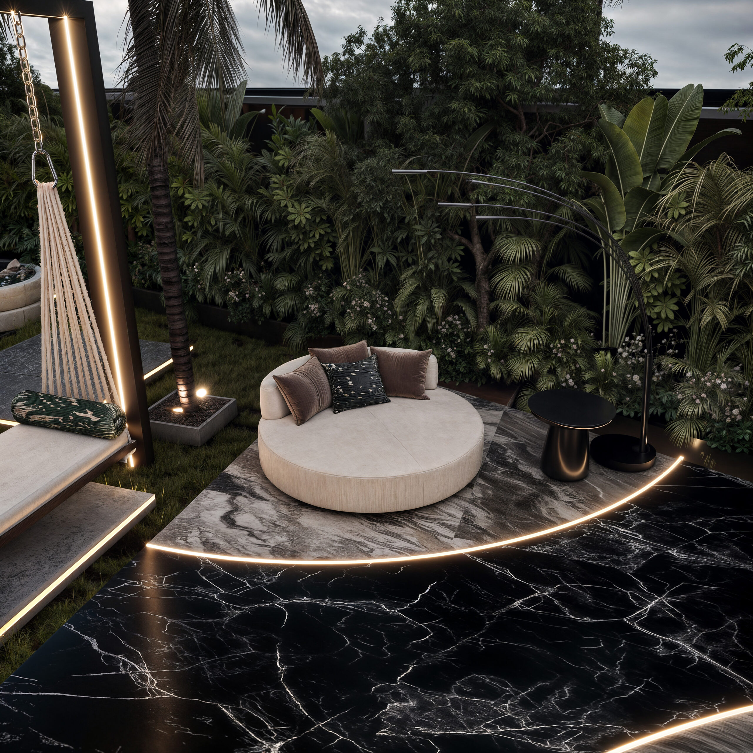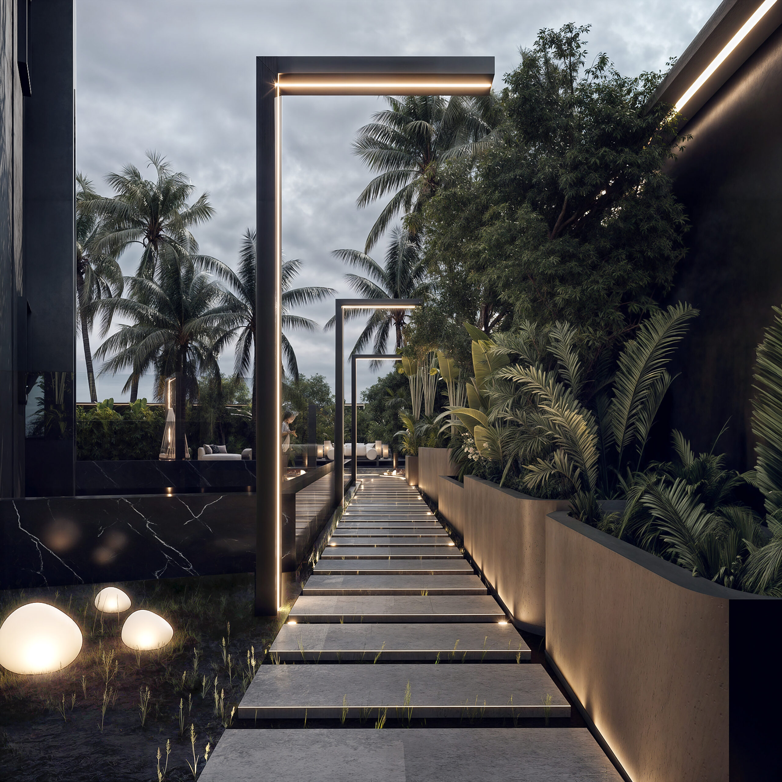 This exclusive exterior design creates an ultra-luxury entertainment space through sophisticated lighting and water features. The contemporary architectural design seamlessly blends the indoor and outdoor areas, defining a high-end lifestyle characterized by dramatic aesthetics and unparalleled quality.